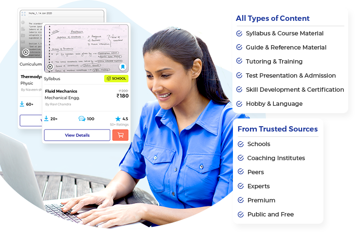 Explore all types of academic content in one platform from school syllabuses, curriculums, coaching materials, peer notes, along with expert, premium and free learning content.